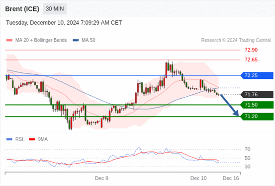 布伦特原油 (ICE)? (G5)? 当日内: 目标位为71.20。