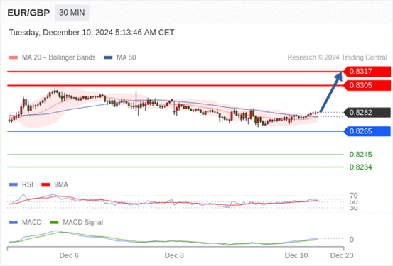欧元/英镑 当日内: 看涨,当 0.8265 为支撑位。