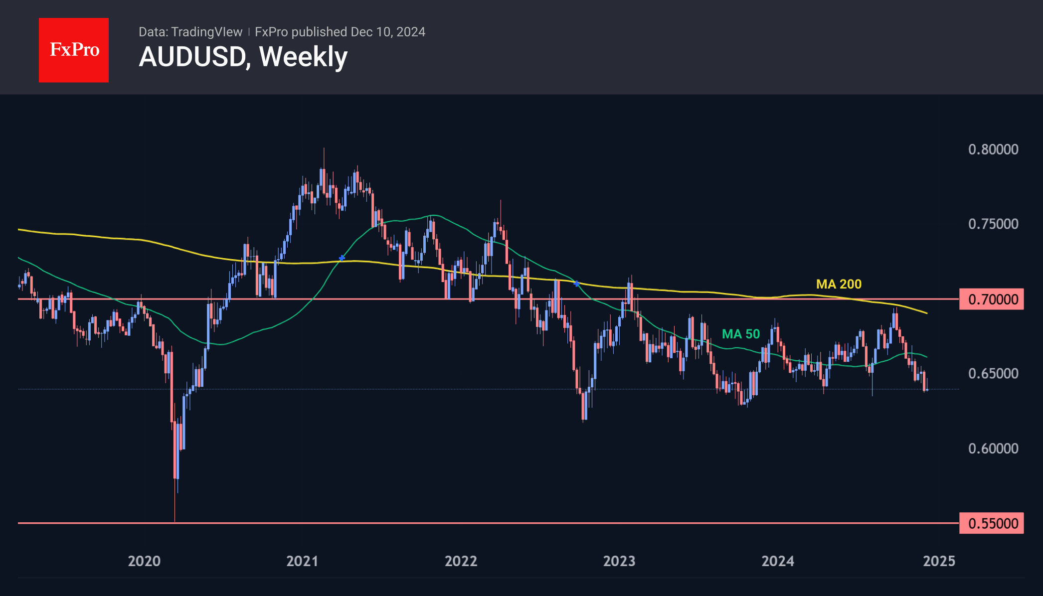 澳元兑美元汇率为 0.6400,处于过去两年波动区间的下限,在过去 10 周内下跌了约 8%。从技术上讲,这是 200 周移动平均线下行趋势的逆转。现在,重要的是观察此货币对在未来几周的表现。长期支撑位的突破将为跌至 0.55 奠定基础。保持以上值将触发重返0.70价位的情况。