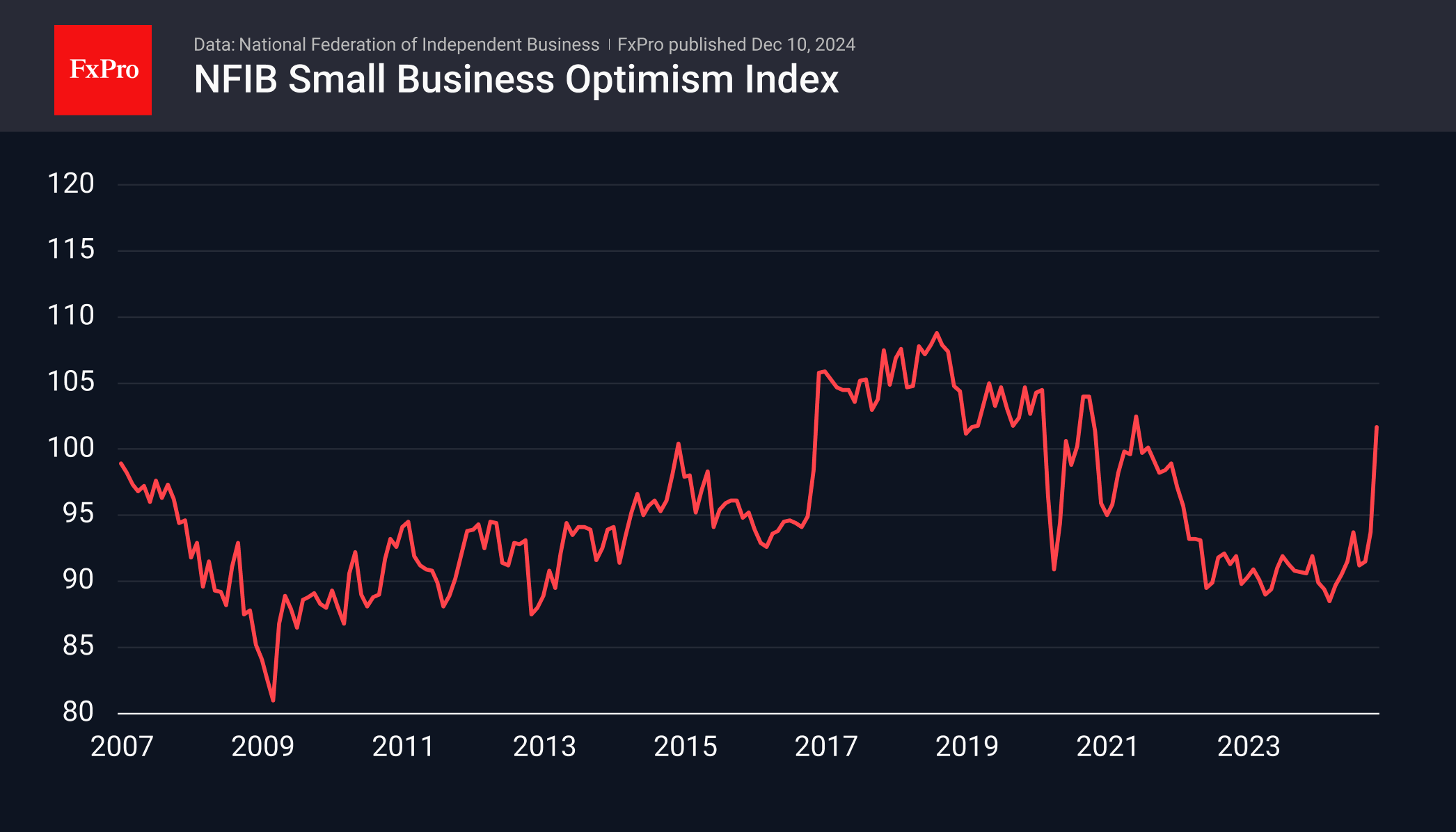 自 11 月大选以来,小企业变得更加乐观,小企业乐观指数上升了8个百分点就证明了这一点。 2016 年唐纳德·特朗普获胜后也出现了类似的飞跃。