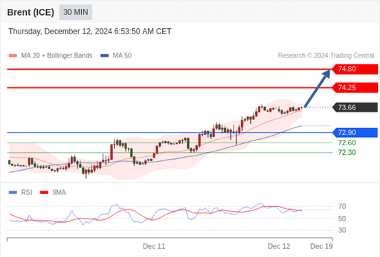 在 72.90 之上,看涨,目标价位为 74.25 ,然后为 74.80 。