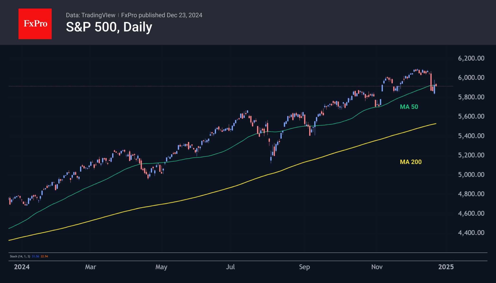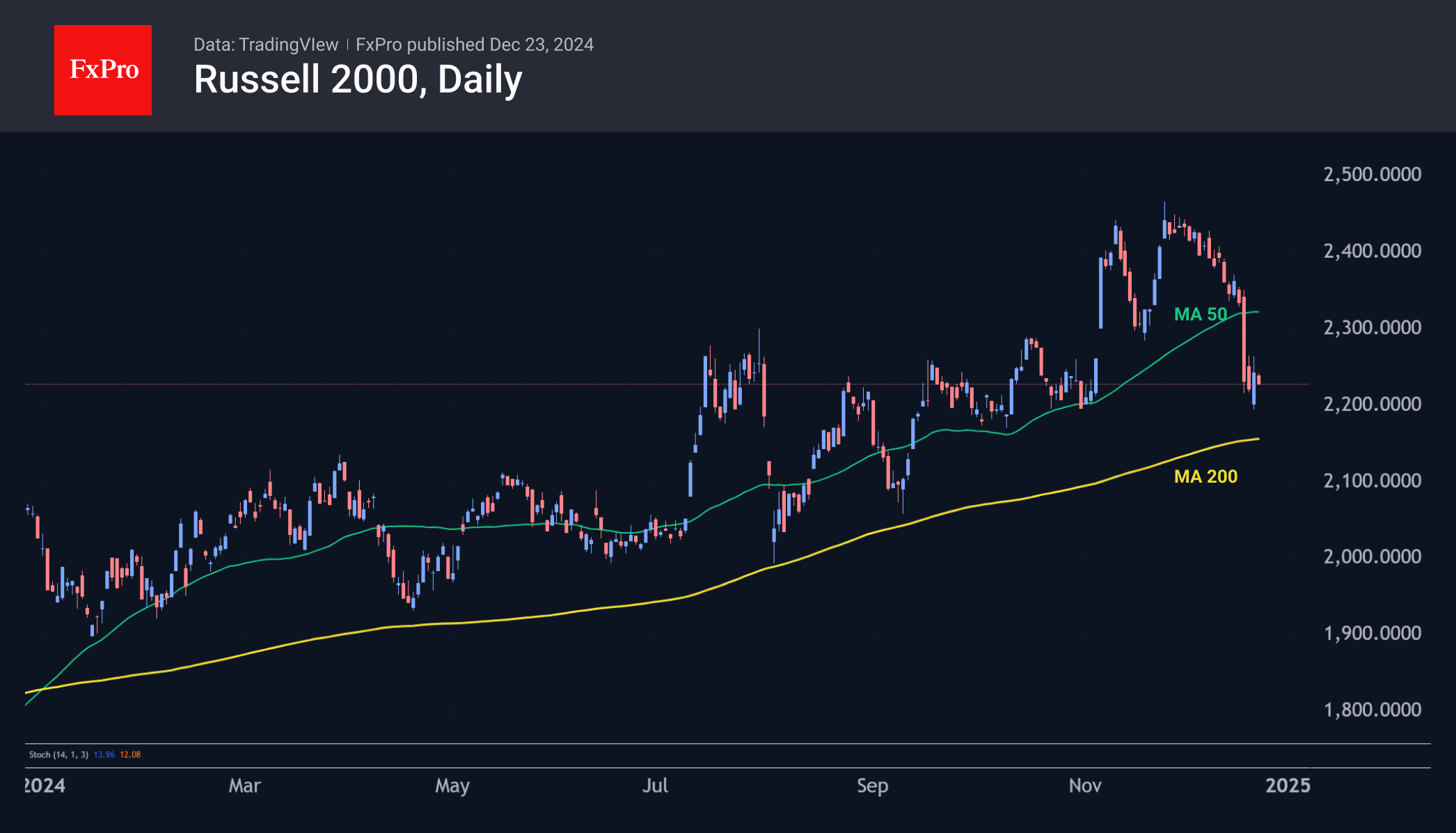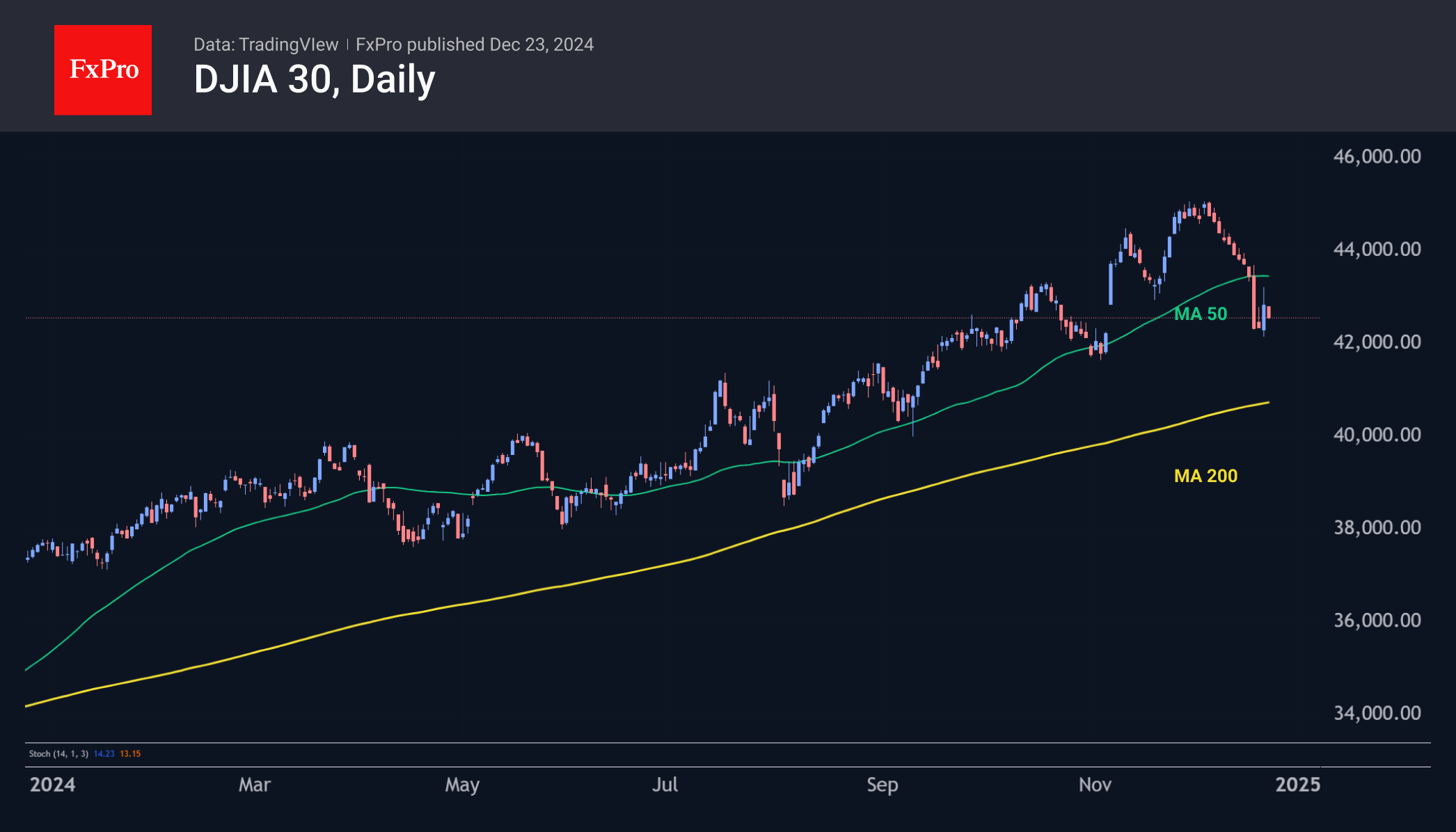首先,道琼斯指数出现了连续11个交易日的下跌。这是该指数历史上持续时间最长的抛售行情之一。大多数时候,下跌幅度并不是特别大,但在12月18日,由于美联储预期的变化给市场带来压力,情况有所不同。这种下跌加速的情况与指数跌破50日移动平均线同时发生,自8月以来,该指数一直在50日移动平均线附近徘徊。基于这一迹象,我们可以说中期上升趋势已被打破,这为指数跌至200日移动平均线开辟了道路。200日移动平均线穿过40800点,并且到年底,其目标是向上达到41000点。