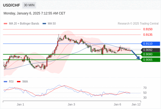 美元/瑞郎 当日内: 短期关键阻力位在0.9110。