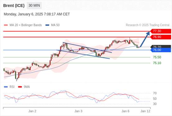 在 76.00 之上,看涨,目标价位为 76.90 ,然后为 77.30 。