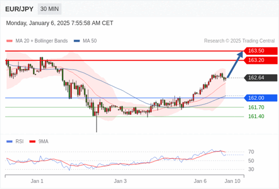 在 162.00 之上,看涨,目标价位为 163.20 ,然后为 163.50 。