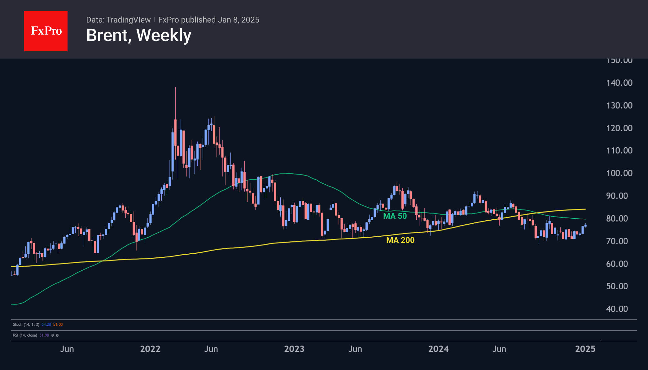 重要的200日移动均线位于WTI 75美元/桶附近,布伦特原油78.8美元/桶附近,将下行趋势与上行趋势分开。北海品种仍有2%左右的上涨空间,而美国品种已经在测试这条线。