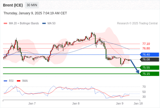 布伦特原油 (ICE)? (H5)? 当日内: 短期关键阻力位在76.40。