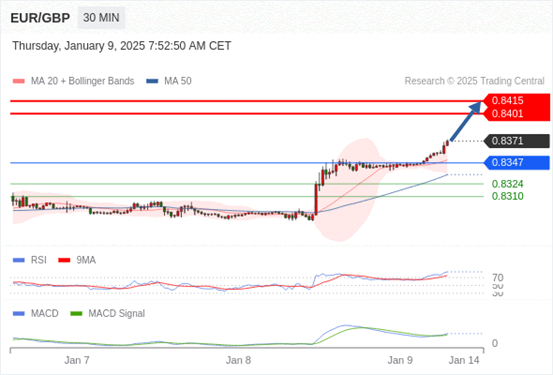 欧元/英镑 当日内: 看涨,当 0.8347 为支撑位。