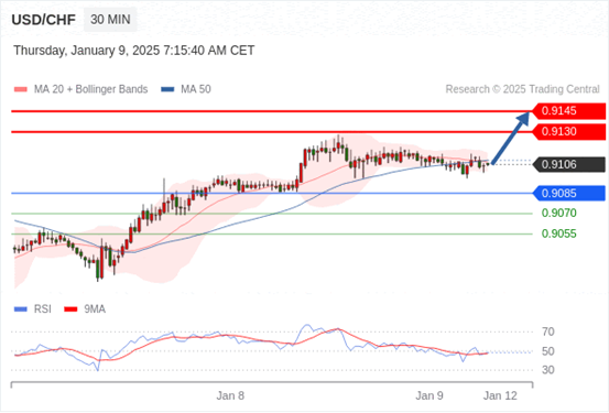 在 0.9085 之上,看涨,目标价位为 0.9130 ,然后为 0.9145 。