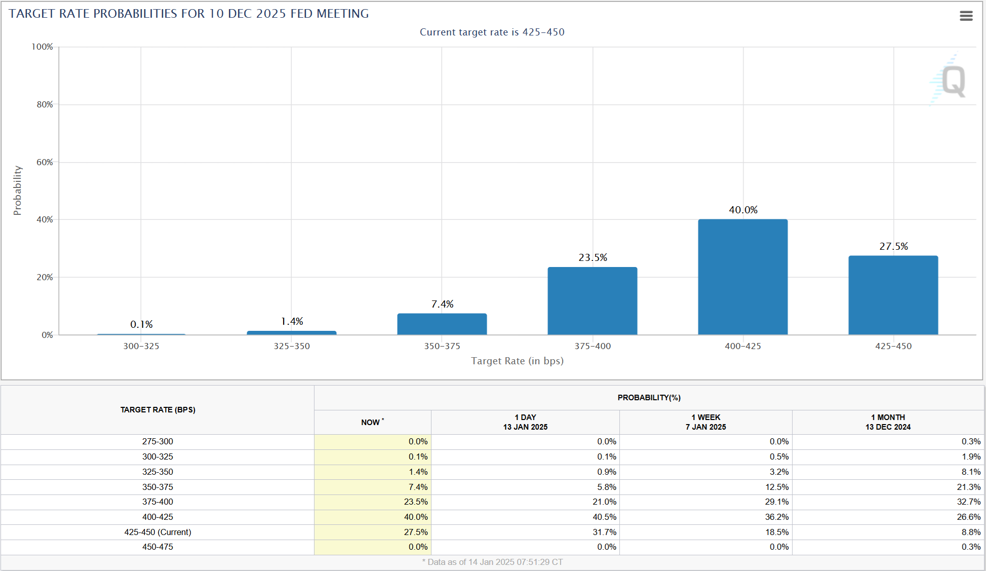 这对市场来说是一个积极的消息,最近几周,市场对2025年美联储将更加鹰派的预期已经增强。周一上午,当市场预计联邦基金利率在年底前保持不变的可能性为32%时,美元触及了当地的高点。最新数据显示,这一预估数据已降至27.5%。.