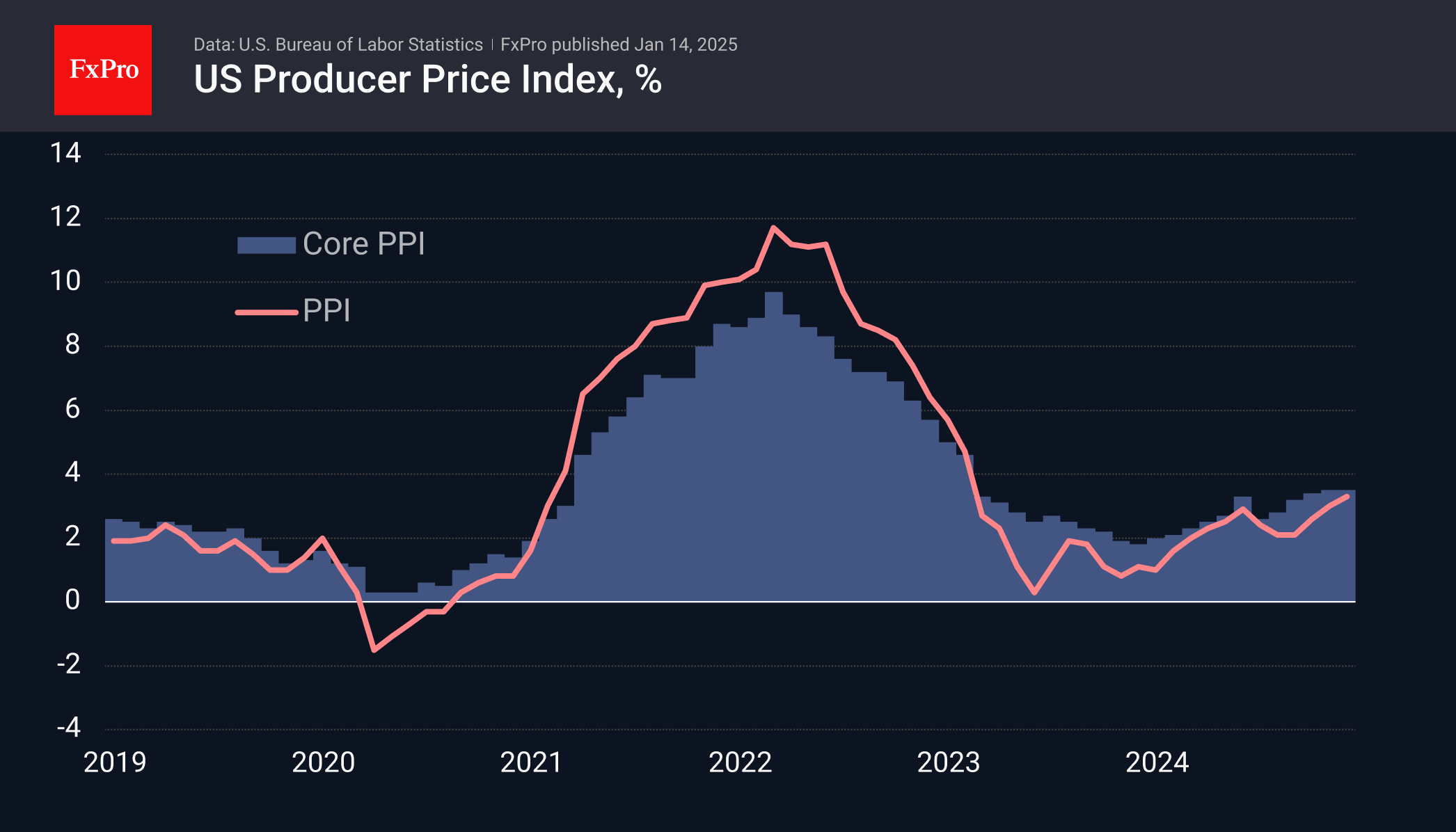 去年12月PPI上涨0.2%,低于上月的0.4%。虽然价格增速从上年同期的3.0%加速升至3.3%,但这仍低于3.5%的平均预期。不包括波动食品和能源的核心PPI当月几乎没有变化,同比增长率为3.5%,而预期的增幅为3.8%。