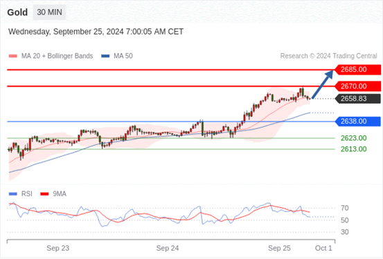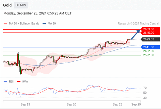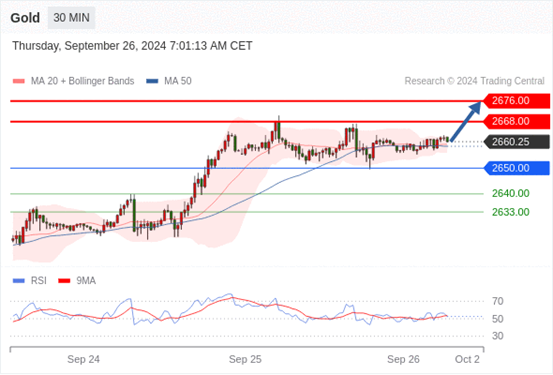 查看交易中心全球研究部门今日的市场观点。从受欢迎的交易产品中探索新的交易方法与机会。 欧元/美元黄金现货英镑/美元欧元/日元欧元/英镑美元/瑞郎德国DAX指数期货(urx)布伦特原油(IC)英国富时100指数期货 黄金现货当日内:在2650.00之上,看涨。 转折点: 2650.00 交易策略: 在2650.00之上,看涨,目标价位为2668.