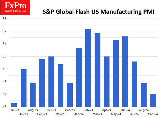 注:此文章由Fxro高级分析师AlxKutikvich撰写 美国I的初步估计显示,制造业活动进一步恶化,但服务业仍是经济的坚实驱动力。 制造业I从8月份的47.9降至9月份的47.0,预计将升至48.6。该指数低于50,表明美国经济活动自7月份以来一直在收缩。这一数据与美联储上周公布的8月份制造业活动的激增形成了鲜明对比。 服务业
