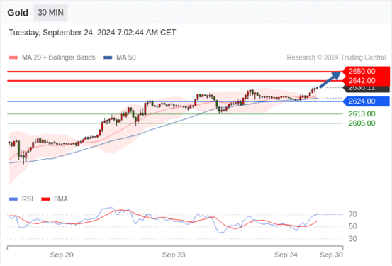 查看交易中心全球研究部门今日的市场观点。从受欢迎的交易产品中探索新的交易方法与机会。 欧元/美元黄金现货英镑/美元欧元/日元欧元/英镑美元/瑞郎德国DAX指数期货(urx)布伦特原油(IC)英国富时100指数期货 黄金现货当日内:新一轮上升。 转折点: 2624.00 交易策略: 在2624.00之上,看涨,目标价位为2642.00,然后
