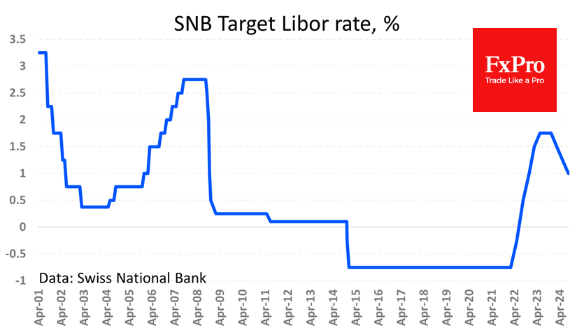 注:此文章由Fxro高级分析师AlxKutikvich撰写 瑞士国家银行将其关键利率下调0.25个百分点至1.0%,达到了预期目标,这是继3月和6月两次各下调0.50个百分点之后,瑞士国家银行放慢了利率正常化的步伐。该央行警告说,未来几个季度还将进一步降息。在一份评论中,瑞士央行指出通胀进一步明显放缓,并将2024年底的预期从1.4