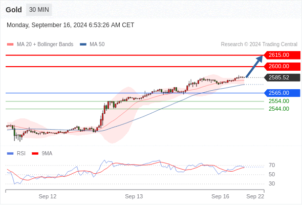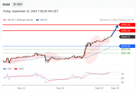 查看交易中心全球研究部门今日的市场观点。从受欢迎的交易产品中探索新的交易方法与机会。 欧元/美元黄金现货英镑/美元欧元/日元欧元/英镑美元/瑞郎德国DAX指数期货(urx)布伦特原油(IC)英国富时100指数期货 黄金现货当日内:目标位为2585.00。 转折点: 2545.00 交易策略: 在2545.00之上,看涨,目标价位为2585.00,