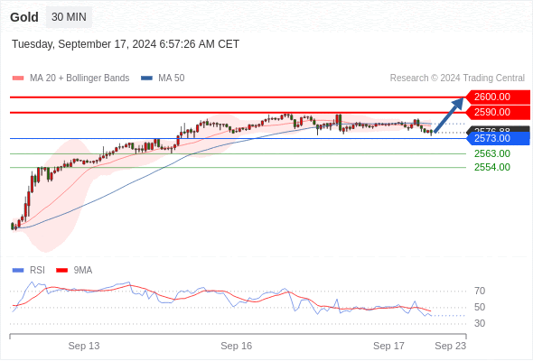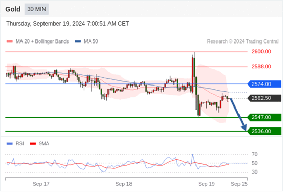 查看交易中心全球研究部门今日的市场观点。从受欢迎的交易产品中探索新的交易方法与机会。 欧元/美元黄金现货英镑/美元欧元/日元欧元/英镑美元/瑞郎德国DAX指数期货(urx)布伦特原油(IC)英国富时100指数期货 黄金现货当日内:短期关键阻力位在2574.00。 转折点: 2574.00 交易策略: 在2574.00之下,看跌,目标价位为2