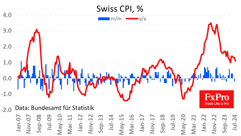 瑞士8月份通胀率从上月的1.3%放缓至1.1%,低于预期的1.2%。在4月和5月,价格涨幅同比上升至1.4%,但后来又开始下降,在过去三个月里下跌了0.2%。 瑞士国家银行在3月和6月两次下调关键利率。然而,价格增长的进一步放缓和瑞士法郎的升值的结合,为进一步放松货币政策打开了大门。 美元兑瑞郎汇率已重新跌至0.8500下