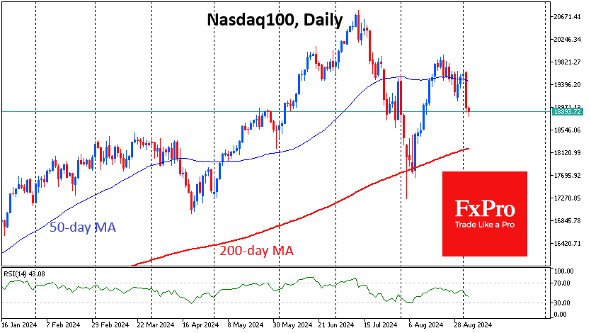 注:此文章由Fxro高级分析师AlxKutikvich撰写,于2024年9月4日晚提供 美国股市遭遇抛售潮,纳斯达克100指数下跌超过3%,标普500指数下跌超过2%,这是近一个月来最大的跌幅。随着反垄断调查的加剧,英伟达股价下跌超过10%。 VIX指数飙升45%达到22.6,这与8月初的情况类似。在我们的观察中,“恐惧指数”在20点以上的巩