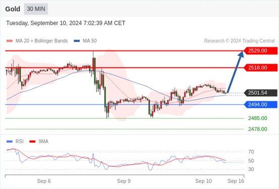 查看交易中心全球研究部门今日的市场观点。从受欢迎的交易产品中探索新的交易方法与机会。 欧元/美元黄金现货英镑/美元欧元/日元欧元/英镑美元/瑞郎德国DAX指数期货(urx)布伦特原油(IC)英国富时100指数期货 黄金现货当日内:进一步上涨。 转折点: 2501.00 交易策略: 在2501.00之上,看涨,目标价位为2529.00,然后