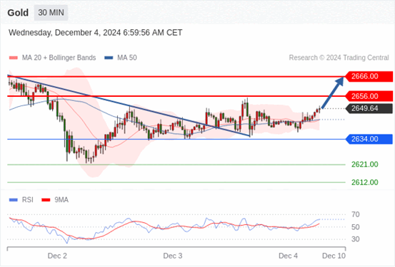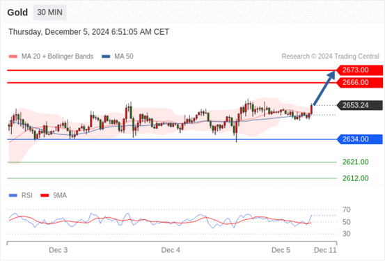 (Fxro浦汇每周新闻--12月5日,点击上方观看视频) 查看交易中心全球研究部门今日的市场观点。从受欢迎的交易产品中探索新的交易方法与机会。 欧元/美元黄金现货英镑/美元欧元/日元欧元/英镑美元/瑞郎德国DAX指数期货(urx)布伦特原油(IC)英国富时100指数期货 黄金现货当日内:目标位为2666.00。 转折点: 2634.0