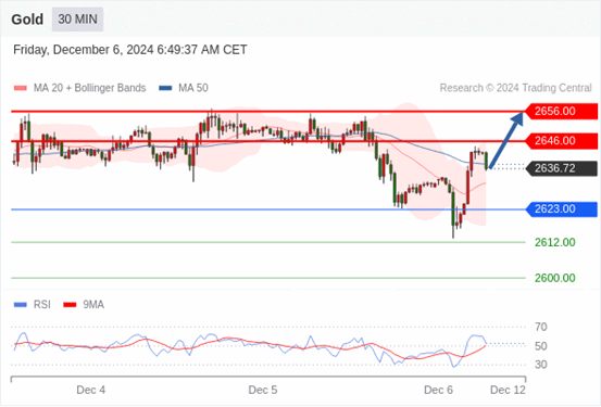 (Fxro浦汇每周新闻--12月5日,点击上方观看视频) 查看交易中心全球研究部门今日的市场观点。从受欢迎的交易产品中探索新的交易方法与机会。 欧元/美元黄金现货英镑/美元欧元/日元欧元/英镑美元/瑞郎德国DAX指数期货(urx)布伦特原油(IC)英国富时100指数期货 黄金现货当日内:上升。 转折点: 2623.00 交易策略: