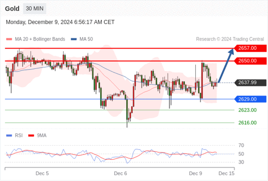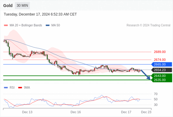 查看交易中心全球研究部门今日的市场观点。从受欢迎的交易产品中探索新的交易方法与机会。 欧元/美元黄金现货英镑/美元欧元/日元欧元/英镑美元/瑞郎德国DAX指数期货(urx)布伦特原油(IC)英国富时100指数期货 黄金现货当日内:短期关键阻力位在2665.00。 转折点: 2665.00 交易策略: 在2665.00之下,看跌,目标价位为2