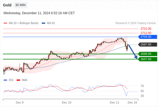 查看交易中心全球研究部门今日的市场观点。从受欢迎的交易产品中探索新的交易方法与机会。 欧元/美元黄金现货英镑/美元欧元/日元欧元/英镑美元/瑞郎德国DAX指数期货(urx)布伦特原油(IC)英国富时100指数期货 黄金现货当日内:调整。 转折点: 2704.00 交易策略: 在2704.00之下,看跌,目标价位为2668.00,然后为2657.