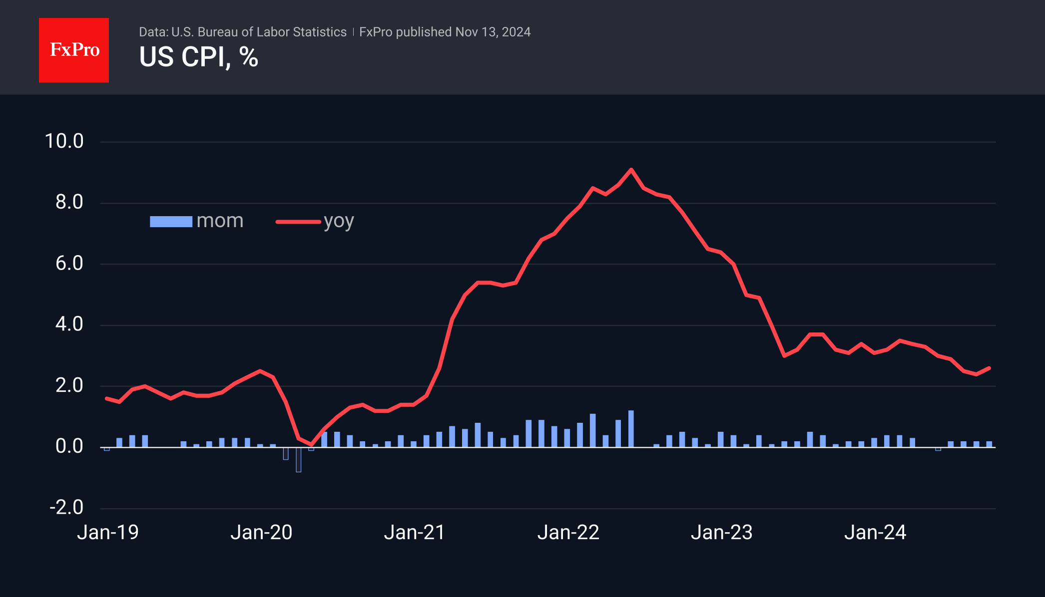 注:此文章由Fxro高级分析师AlxKutikvich撰写 美国消费者通胀与分析师的平均预期一致,但仍引发美元走软,以及市场对购买股票的兴趣增加。这一反应表明,交易员预计数字会更高,未来几个月美联储将略微转向更温和。 总体CI连续第四个月增长0.2%,每年增长率从2.4%攀升至2.6%。虽然这高于2%的目标,但不应阻止央行在12