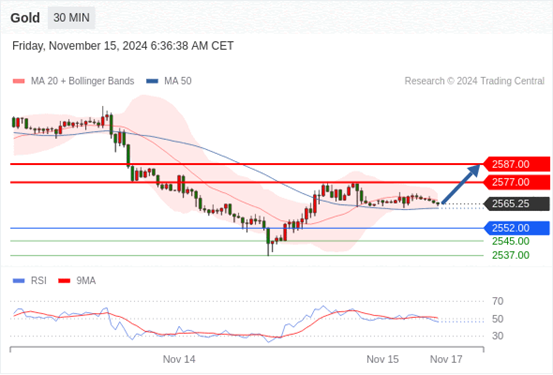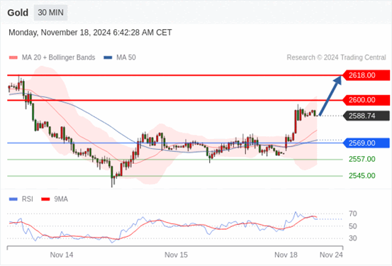 查看交易中心全球研究部门今日的市场观点。从受欢迎的交易产品中探索新的交易方法与机会。 欧元/美元黄金现货英镑/美元欧元/日元欧元/英镑美元/瑞郎德国DAX指数期货(urx)布伦特原油(IC)英国富时100指数期货 黄金现货当日内:在2569.00之上,看涨。 转折点: 2569.00 交易策略: 在2569.00之上,看涨,目标价位为2600.