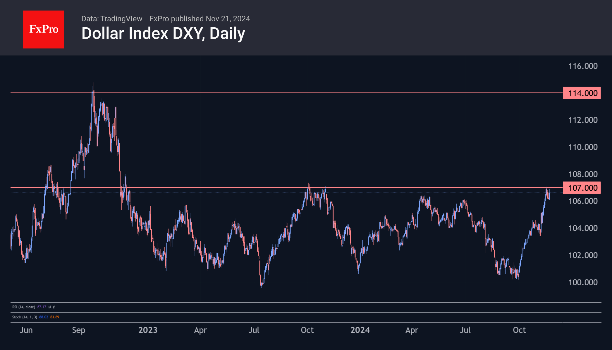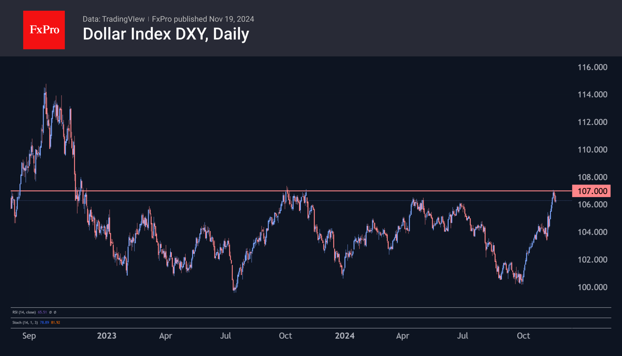 注:此文章由Fxro高级分析师AlxKutikvich撰写 美元指数正在从周四的高点回落,与基本面力量的逻辑背道而驰。这种行为带来一个问题:要么美元指数已经达到了其波动区间的极限,要么这是在长期反弹之后的一次长期的仓位震荡。 美元指数(DXY)上周四涨至106.99,几乎重现2023年10月107.04的高点。近期的高点略高于今年4