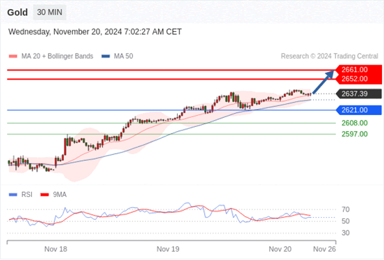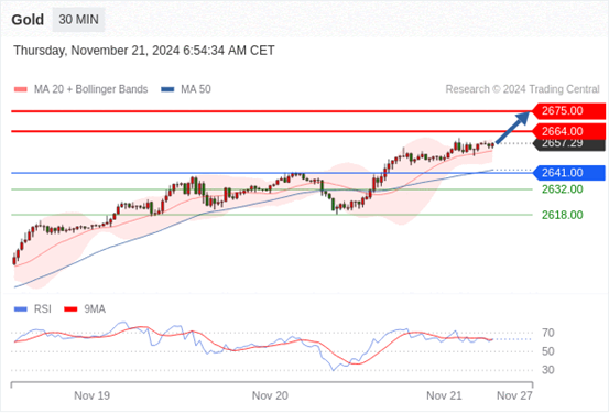 查看交易中心全球研究部门今日的市场观点。从受欢迎的交易产品中探索新的交易方法与机会。 欧元/美元黄金现货英镑/美元欧元/日元欧元/英镑美元/瑞郎德国DAX指数期货(urx)布伦特原油(IC)英国富时100指数期货 黄金现货当日内:目标位为2675.00。 转折点: 2641.00 交易策略: 在2641.00之上,看涨,目标价位为2664.00,