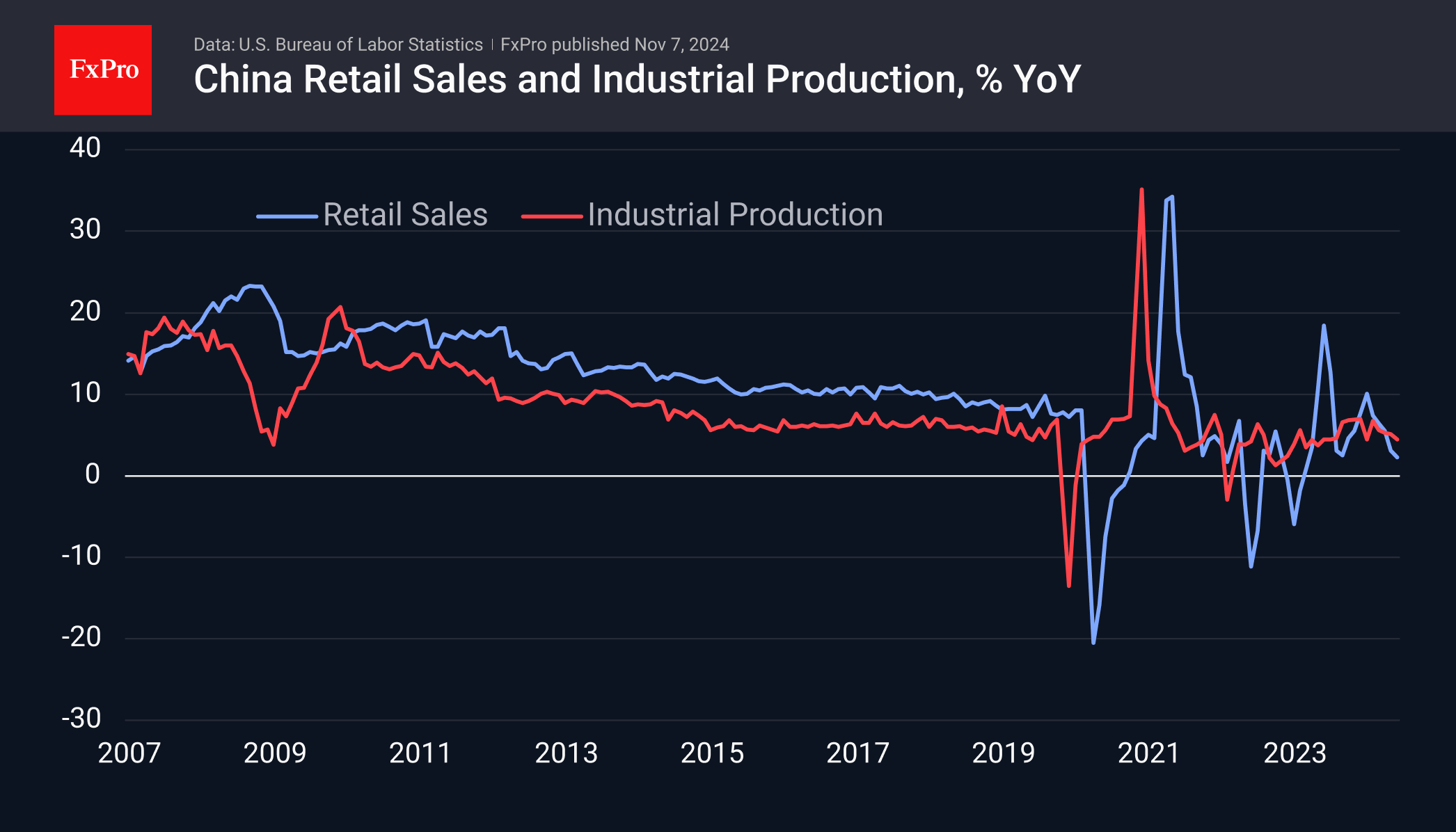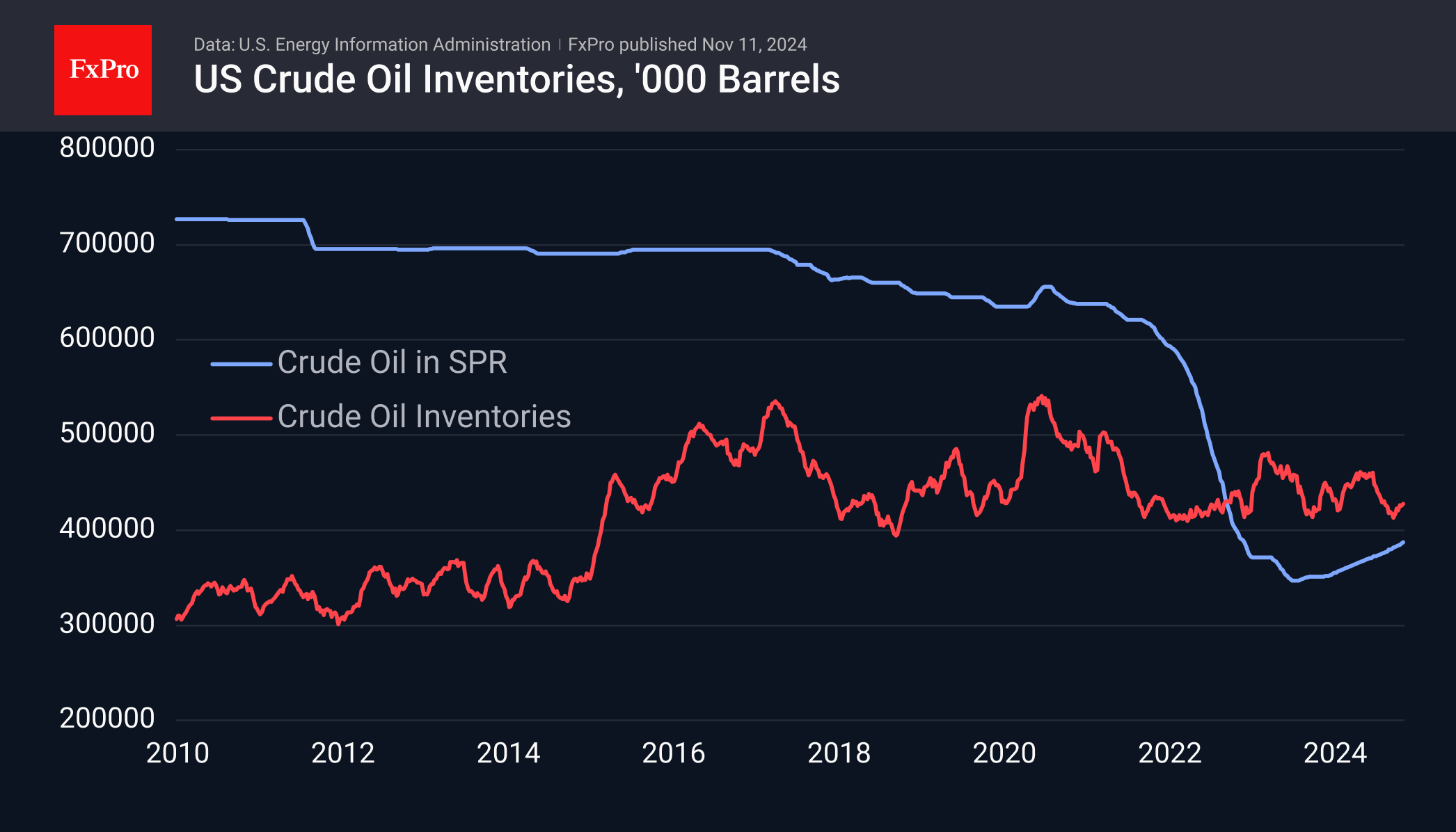 注:此文章由Fxro高级分析师AlxKutikvich撰写 原油 自周一开始,每桶原油价格已下跌1.6%,这使得过去两个交易日的累计跌幅达到4%。油价面临的压力包括以色列和黎巴嫩之间停火谈判释放出的信号(降低供应风险),以及对中国经济刺激计划规模的失望(修正预期需求)。 在较长期的因素中,美国石油库存的上升趋势仍在持
