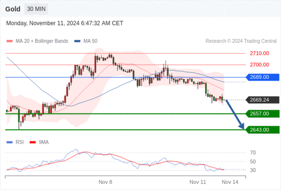 查看交易中心全球研究部门今日的市场观点。从受欢迎的交易产品中探索新的交易方法与机会。 欧元/美元黄金现货英镑/美元欧元/日元欧元/英镑美元/瑞郎德国DAX指数期货(urx)布伦特原油(IC)英国富时100指数期货 黄金现货当日内:短期关键阻力位在2678.00。 转折点: 2678.00 交易策略: 在2678.00之下,看跌,目标价位为2
