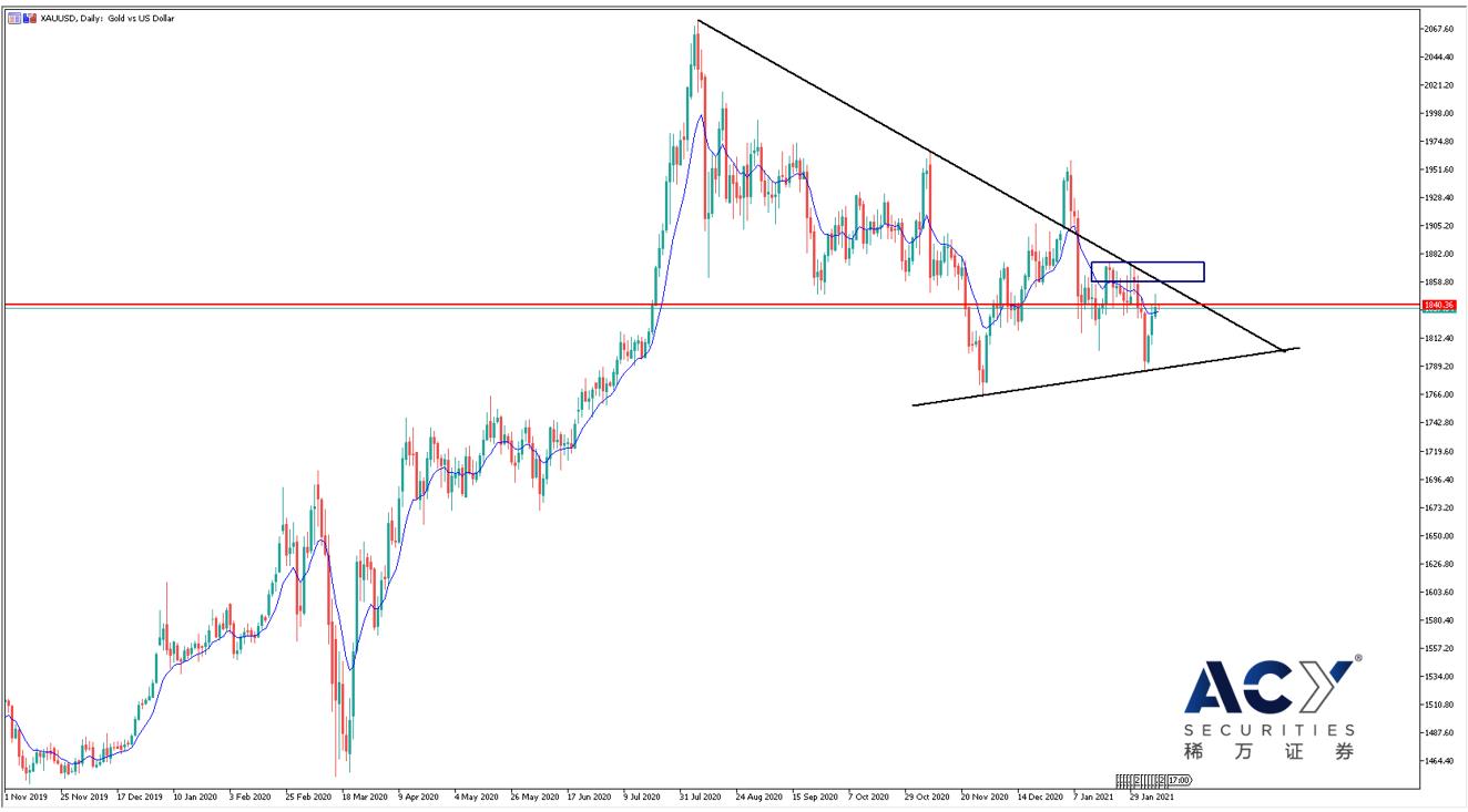 受到美国财政刺激的影响,美元指数连续三日收阴,使所有以美元计价的金融商品都呈现了上涨行情。黄金作为抗通胀商品,在目前货币放水的大环境下一直是部分投资者的关注对象。伴随美元的下跌,黄金现货同样呈现了三连阳,大涨近50美元,昨日收报1838美元/盎司。投资者们都想知道这是否是黄金转强的信号。目前黄金的走势主要还是受到两方面影响,一方面是刺激方案的推进程度,或者说美元的走势,另一方面则是黄金本身的基本面价值。