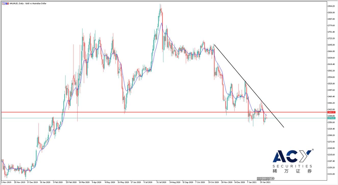 由于澳洲是黄金第二大出口国,金价受到澳币汇率的影响较小。所以在分析黄金价格时,以澳币计价的黄金价格有参考的价值。从黄金澳币日线图来看,黄金从去年8月份开始经历了3个月的价格整理后开始下行,而近3个月的下行趋势较为明显。这证明了金价的基本面价值目前仍属于利空。从长线来看,K线形成了M顶的形态,而目前已经突破了2400的颈线位置,整体下行动力较强,所以短线金价不管是以美元计价还是澳币计价,都是以逢高做空为主。