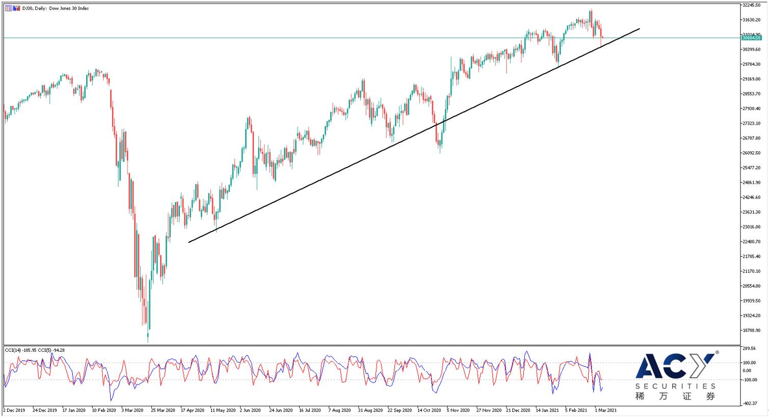 随着科技板块的大跌,市场中的行业轮动现象愈发明显,道指的表现较为坚韧。从道指日线图来看,股指昨日同样大跌,不过在收盘前快速反弹,并在31000下方站稳。现价下方的趋势线再次呈现了强支撑效果,伴随疫情控制与刺激方案落地,道指有望维持住目前的上涨趋势。指标方面,CCI趋势指标快线已经形成了锐角反转,同时快慢线间距扩大,有收敛的迹象。CCI的向上收敛表现了短线多头局势,入场多单可以在趋势线上方附近入场。不过由于整体股市的走弱,多单操作还是以短线为主。现价下方的支撑位置在30500附近。