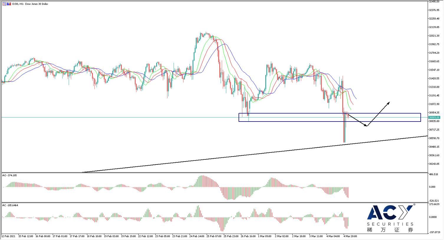 从一小时图来看,昨日指数大跌后在30500附近受到强支撑,快速收回了前一小时的跌幅。目前价格在30900附近整理,还未走出明显趋势。指标方面来看,鳄鱼线还没有触及K线,短线大涨的可能性不大,K线可能在现价位置进行整理。AO线呈现五连红,保持了下行动力,不过AC线却已经飘绿说明下行动力有所缓解。整体来看,短线做多需要等待价格止跌。30700-30800附近将提供一定的支撑效果,不过支撑力量较弱。而30500附近是趋势线支撑,支撑效果更强。
