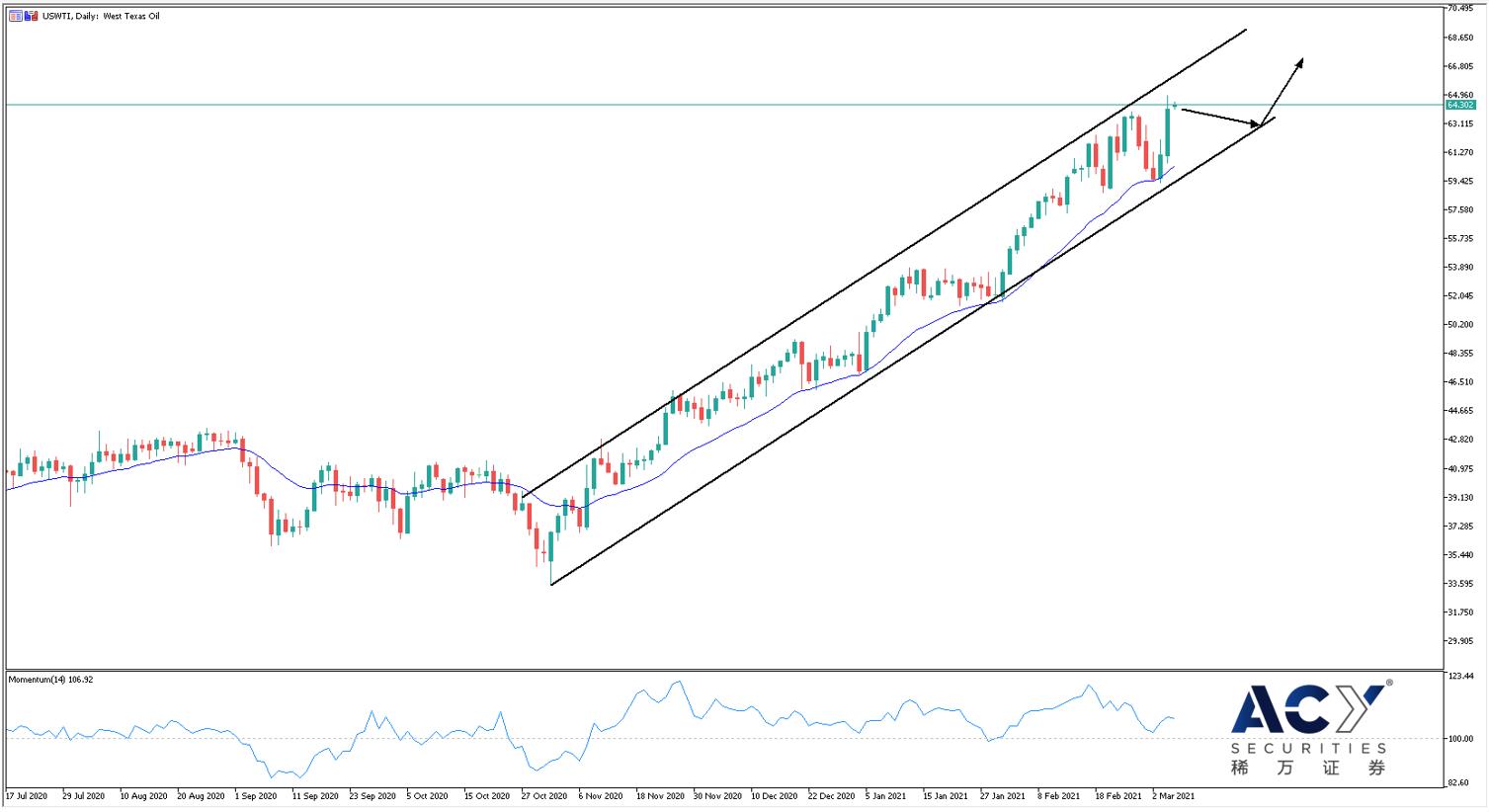 昨日的OPEC会议决定也在意料之中,沙特方面的自愿减产并没有被完全取消,而是开始逐步增产。全球原油的供应速度仍然保持了缓慢增产,利好了原油的价格。从WTI美油日线图来看,之前提到,如果OPEC决定缓慢增产,那么油价会在59-60区间受到趋势线支撑,并逐渐上行。目前油价的走势也证明了这一点,在触及到59.4的短线低位后,油价快速反弹并再次突破前高,最高接近65美元/桶。不过由于K线处在通道当中,短线多单并不适合突破跟随,还是要以通道下沿与20日均线的支撑为准。动量指标释放了相同的信号,指标高点降低,形成钝角拐点,短线有技术性回调的可能。不过由于基本面的强势,下方支撑可以看趋势线上63附近的位置。