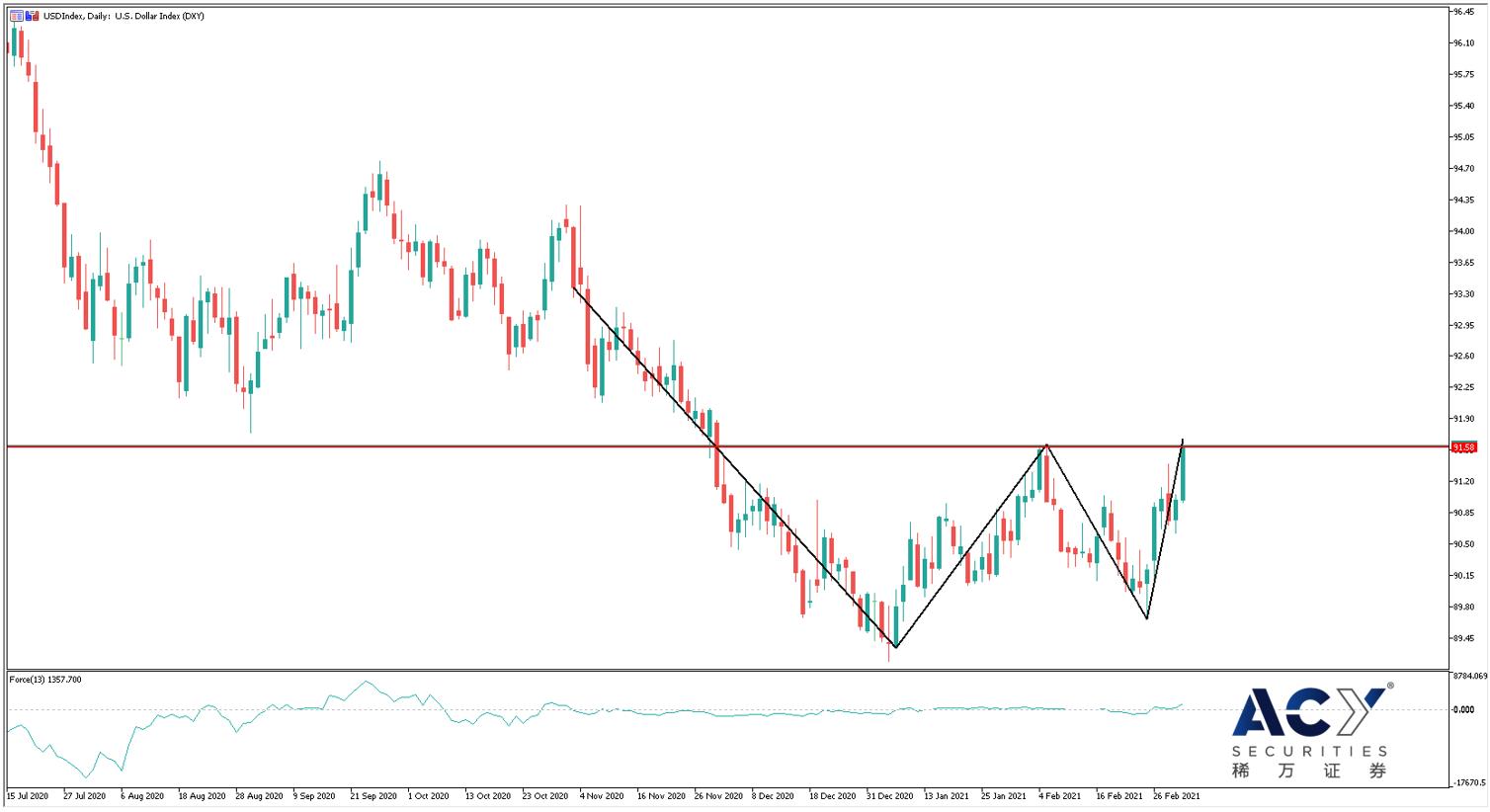 伴随美债收益率上涨,美元指数也上升到了关键位置。从日线图来看,美元指数已经在底部形成了W底反转形态,指数目前正在测试颈线的阻力。一旦突破,双底形态成立,那么美元指数的上行空间就被打开。指标方面,强力指标在穿破零线后,小幅回调,不过目前再次转头上行,说明了美元的走强趋势。考虑到目前美元受到美债收益率的驱动,美元仍有较大的补涨空间,同时收益率也远没有达到目标位置。整体来看,美元可以配合突破做单的方式进行交易。