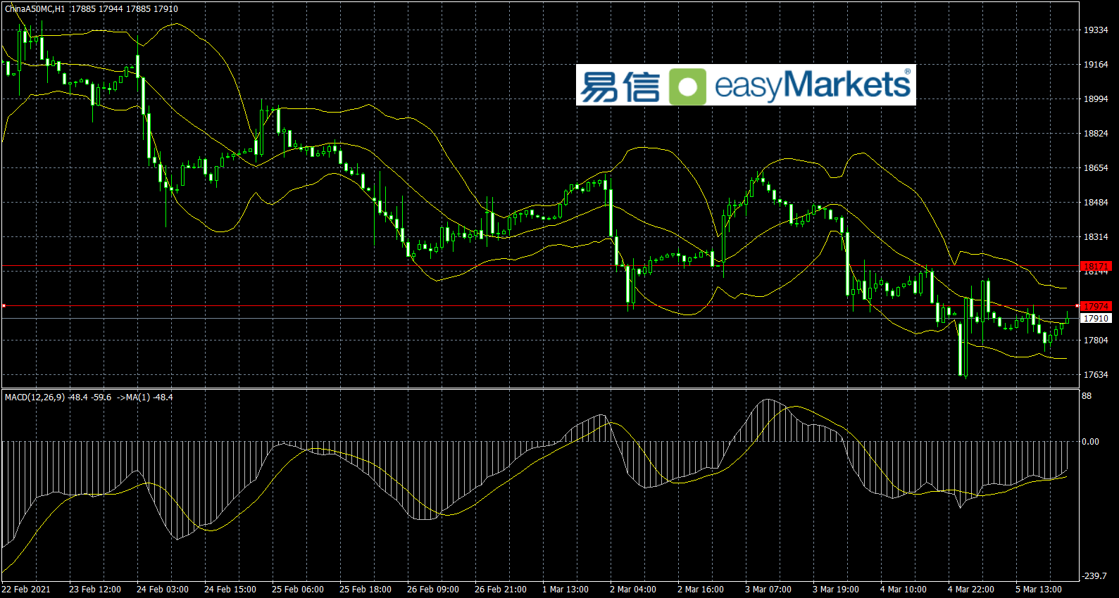 形态看A50指数正在做震荡,下方17750是第一支撑,压力是17100附近第一压力,突破看18150附近。指标看布林线开始横盘,而MACD指标正在向上运行,似乎A50下跌加速得到了一定修复。策略上投资人避免压力位置做都,可以考虑逢低多策略,跌破支撑离场。