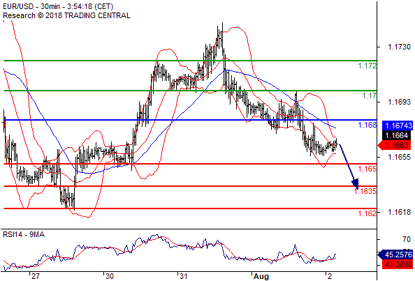 交易策略: 在 1.1680 之下,看,目标价位为 1.1650 ,然后为 1.1635 。