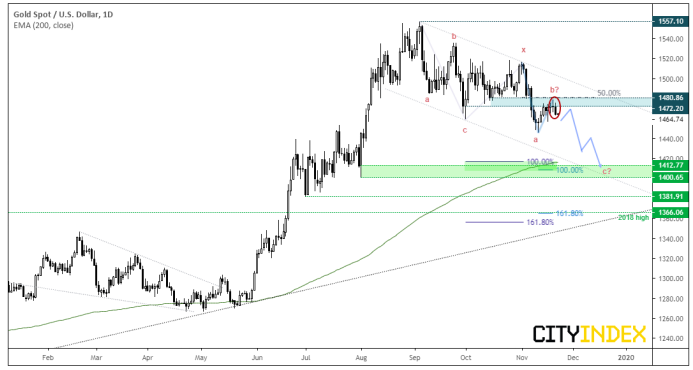 上次分析报告发布以来,黄金创下小新低后温和回调下探1480区域。金价仍处于下跌通道内,在显著下跌之前可能还有更多的上行空间,但1472-1480附近的重要阻力区域目前仍在限制上行,那是50%回档位附近。另请注意,金价数次未能收上1472.20,那是10月31日的收盘低点。
