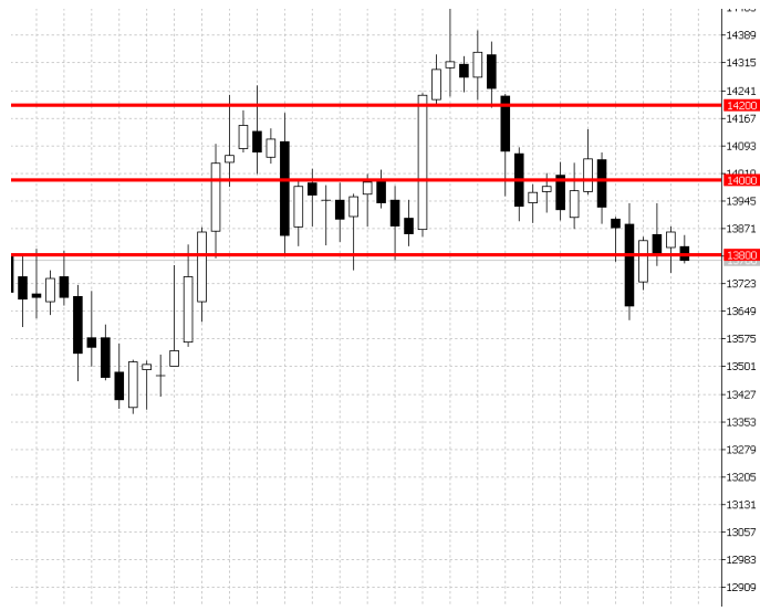 在H4级别上,A50走出了头肩顶技术形态,在技术分析中,这是一个典型的看空技术形态。如果多头要破坏该利空的技术形态,则需要重新上破颈线位(该位置对应14000关键位置)。故而,我们可以将复杂的问题简单化,如果A50指数在14000以下,可以在技术上定义为熊市,如果站上14000,可以在技术上定义为震荡市。