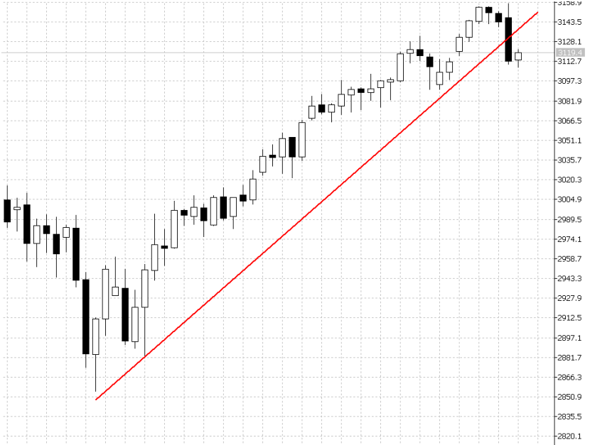 昨日的下跌我们认为具有技术代表性,如下图标普500天图,自10月3日创出2855以来,一路上涨维持了明显的上涨趋势。昨日的下跌,正好是一根阴线明确下破该上升趋势线。在技术分析角度,这是一个未来看空的技术信号。