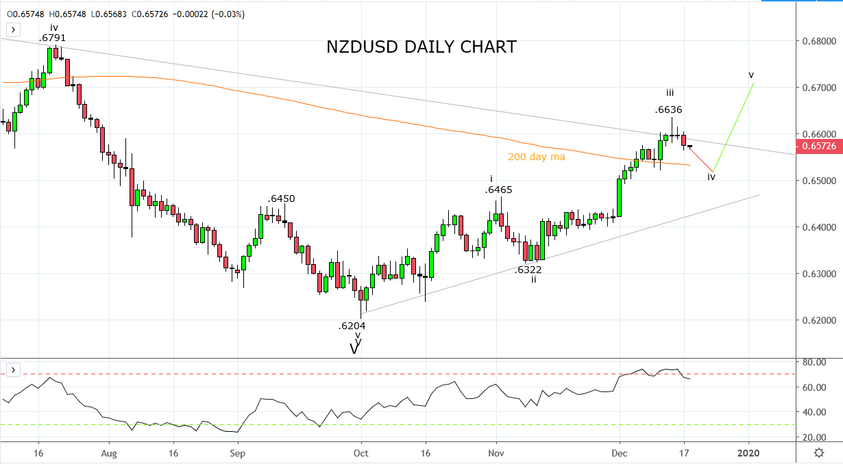 纽元/美元已经到达上行目标0.6600c(趋势线阻力)后,考虑到上文阐述的利好基本面,我在寻找机会重新买入。假设当前回撤继续并且展示出修正的特质,则0.6530/20支撑位(上周低点兼200天均线)是潜在的做多区域,期待2020年上攻0.6680/00。
