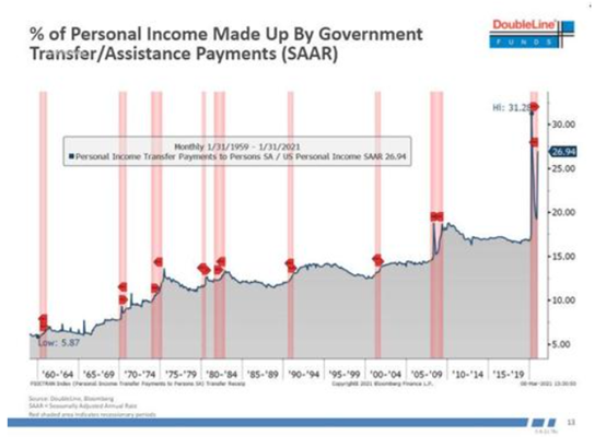 Gundlach指出,在美国居民个人收入构成中,来自政府的补贴收入占比已经达到27%,而刺激计划还需要继续进行。