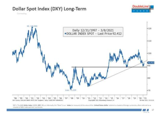 接下来,在谈到美元时,Gundlach表示,尽管他最近几个月一直看涨美元,但他预计美元在短暂反弹后将下跌。