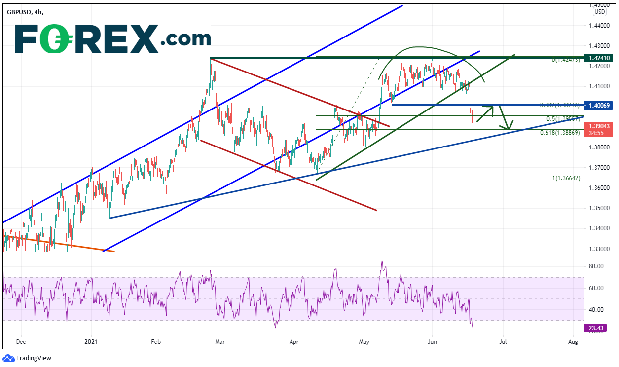 欧元/美元和美元指数走势类似,但走向截然相反,在FOMC声明发布之前,货币对交投于1.2100附近。此后,汇价大跌,探向3月31日低点跌至5月25日高点上行之50%回档1.1980附近。在240分钟时间轴上,货币对现已触及同期走势之61.8%斐波那契回档位,而RSI极端超卖。这表明该货币对可能做好了反弹准备,从而带动RSI回升。此情境下,卖盘可能会在1.1989附近及1.2050上方补充阻力位入场。欧元/美元处在一条较美元指数更长期的看跌楔形内部,目标位落在1.1700。但要达成目标,价格必须首先下破支撑1.1860和1.1745附近上斜趋势线。