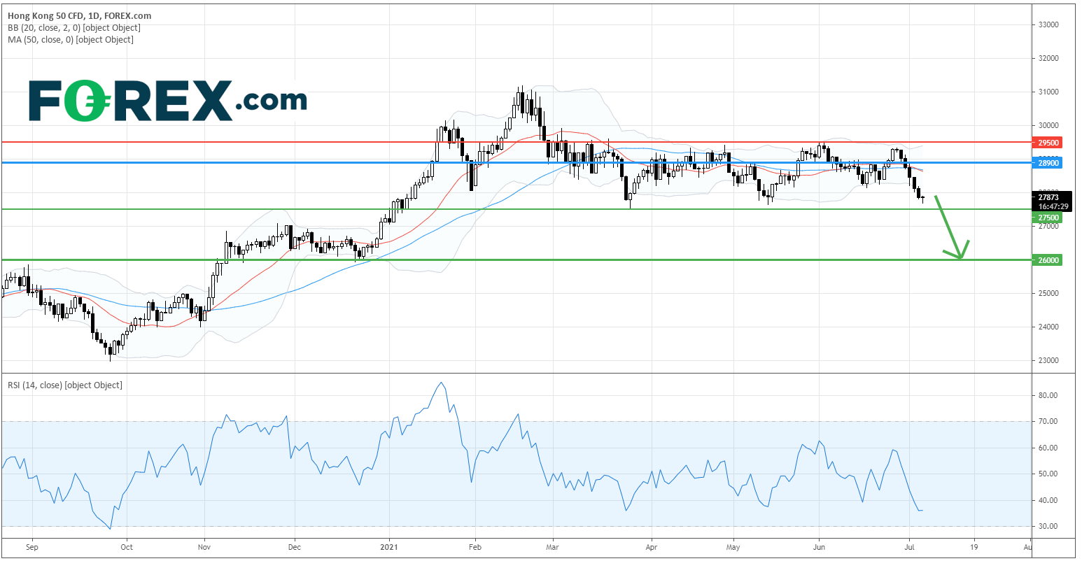 恆生指数CFD由5月高位29,500点回落并在20日和50日均线之下交投。相对强弱指数目前在30多点,表示下行动力强劲。
